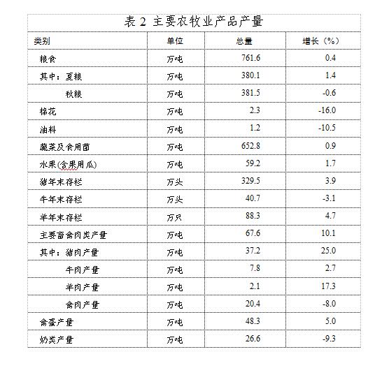 農(nóng)業(yè)發(fā)展穩(wěn)中有進(jìn)。全年農(nóng)林牧漁業(yè)總產(chǎn)值767.11億元,按可比價(jià)計(jì)算,比上年增長(zhǎng)8.7%。農(nóng)林牧漁業(yè)增加值416.65億元,增長(zhǎng)7.5%。其中,農(nóng)林牧漁服務(wù)業(yè)增加值49.73億元,增長(zhǎng)6.0%。糧食再獲豐收,糧食總產(chǎn)量達(dá)到761.6萬噸,比上年增長(zhǎng)0.4%,創(chuàng)歷史新高,連續(xù)7年穩(wěn)定在700萬噸以上。全年主要畜禽肉類總產(chǎn)量67.6萬噸,比上年增長(zhǎng)10.1%;禽蛋產(chǎn)量(不含小品種)48.3萬噸,增長(zhǎng)5.0%;奶類產(chǎn)量26.6萬噸,下降9.3%;水產(chǎn)品產(chǎn)量6.04萬噸,增長(zhǎng)2.7%?!?/p>